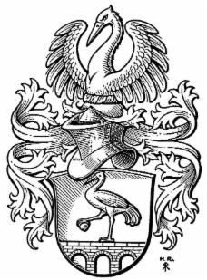 Wappen: In Blau ein auf einer goldenen dreibogigen Brücke stehender weißer Kranich, der im erhobenen rechten Ständer einen goldenen Stein hält. Auf dem rot-silber bewulsteten Helm mit blau-goldener Decke der Kranich mit erhobenen Flügeln wachsend.